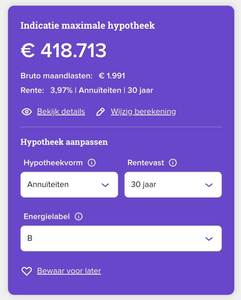 Het is niet makkelijk om in je eentje een huis te kopen tegenwoordig, maar stel je voor je doet dat met zo’n salaris? Wij gaan even rekenen. Als je uitgaat van een annuïteitenhypotheek met een rentevaste periode van 30 jaar en een huis met energielabel B, kom je uit op een maximale hypotheek* van €418.713 (dat zijn ongeveer €1.991 bruto maandlasten).
