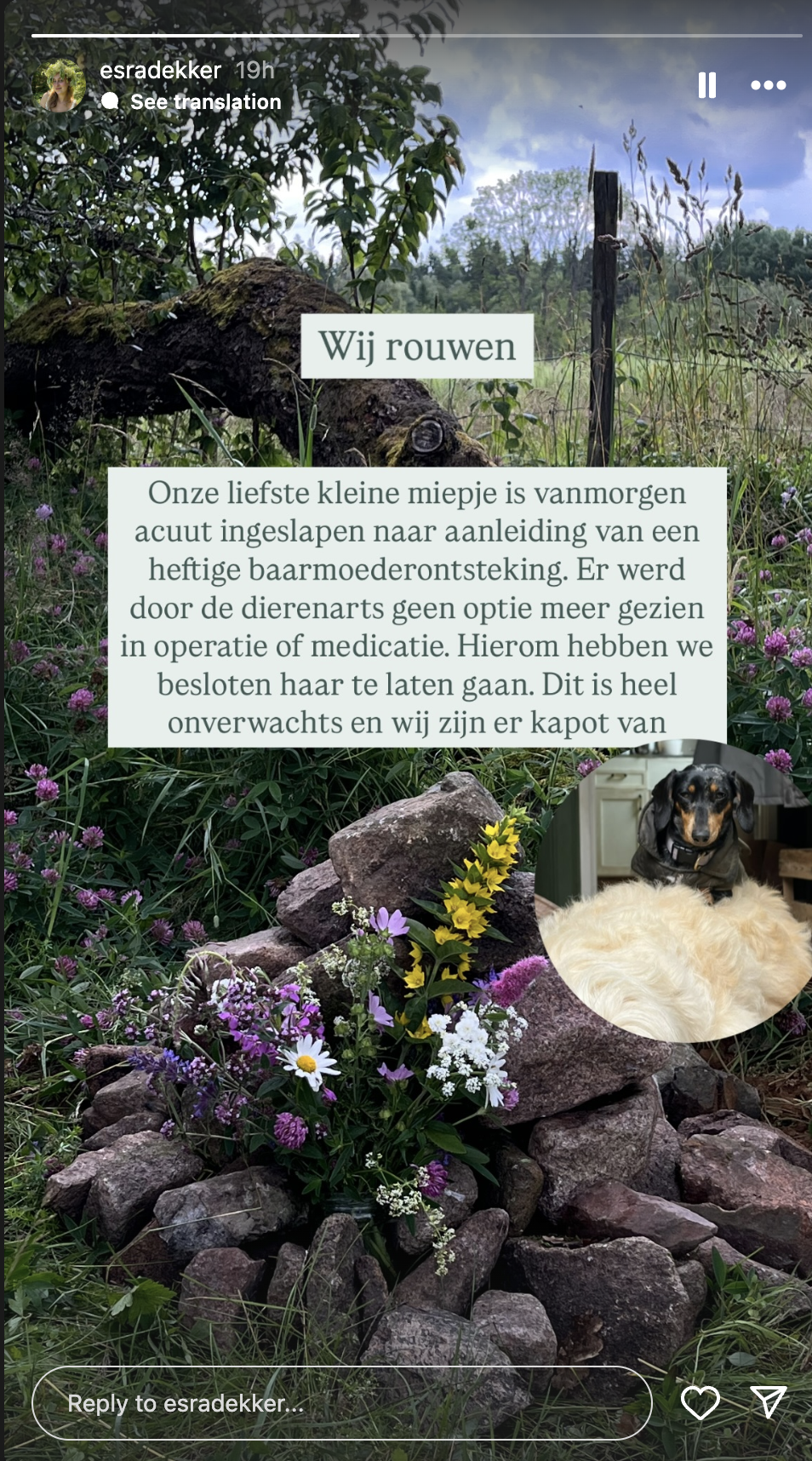 Maar het is niet allemaal rozengeur en maneschijn, zo blijkt. Esra deelt op Instagram dat ze plotseling afscheid hebben moeten nemen van haar hondje, nadat de dierenarts een baarmoederontsteking had ontdekt. Er was niks meer aan te doen en Miep moest worden ingeslapen. “Dit kwam heel onverwachts en we zijn er kapot van”, laat ze weten op Instagram.