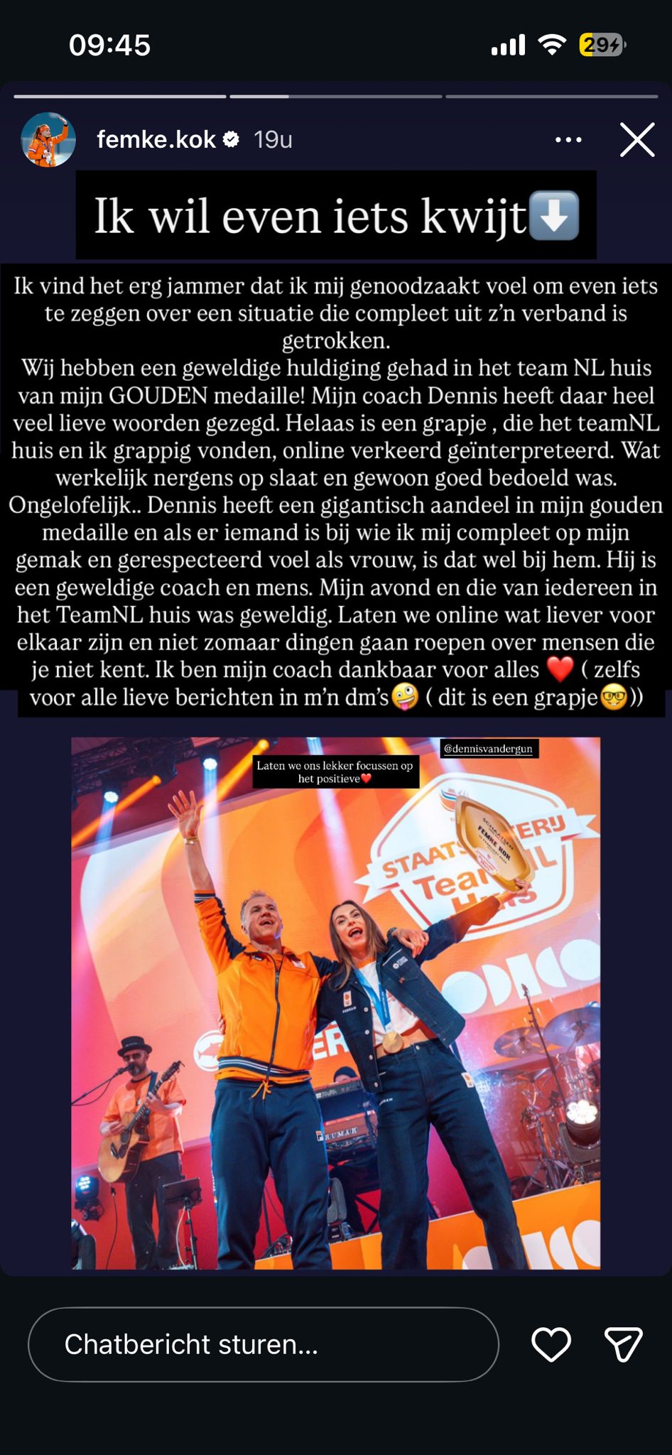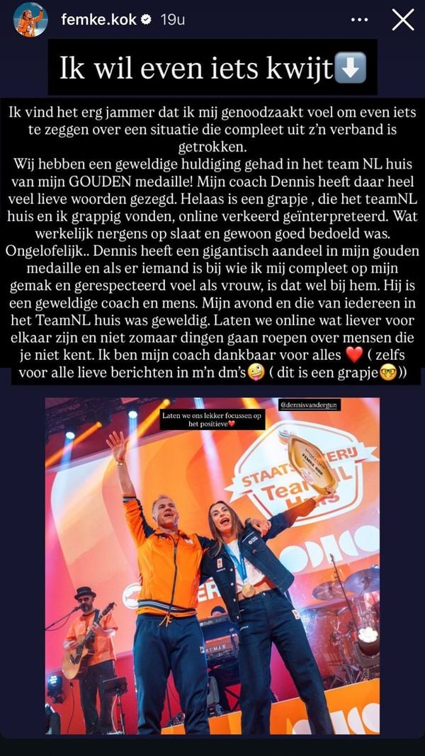 Gistermiddag besloot Femke zelf te reageren via Instagram. “Ik wil even iets kwijt,” schrijft ze. Volgens haar is de grap compleet verkeerd geïnterpreteerd. “Dennis heeft een gigantisch aandeel in mijn gouden medaille en als er iemand is bij wie ik mij compleet op mijn gemak en gerespecteerd voel als vrouw, is dat wel bij hem.”