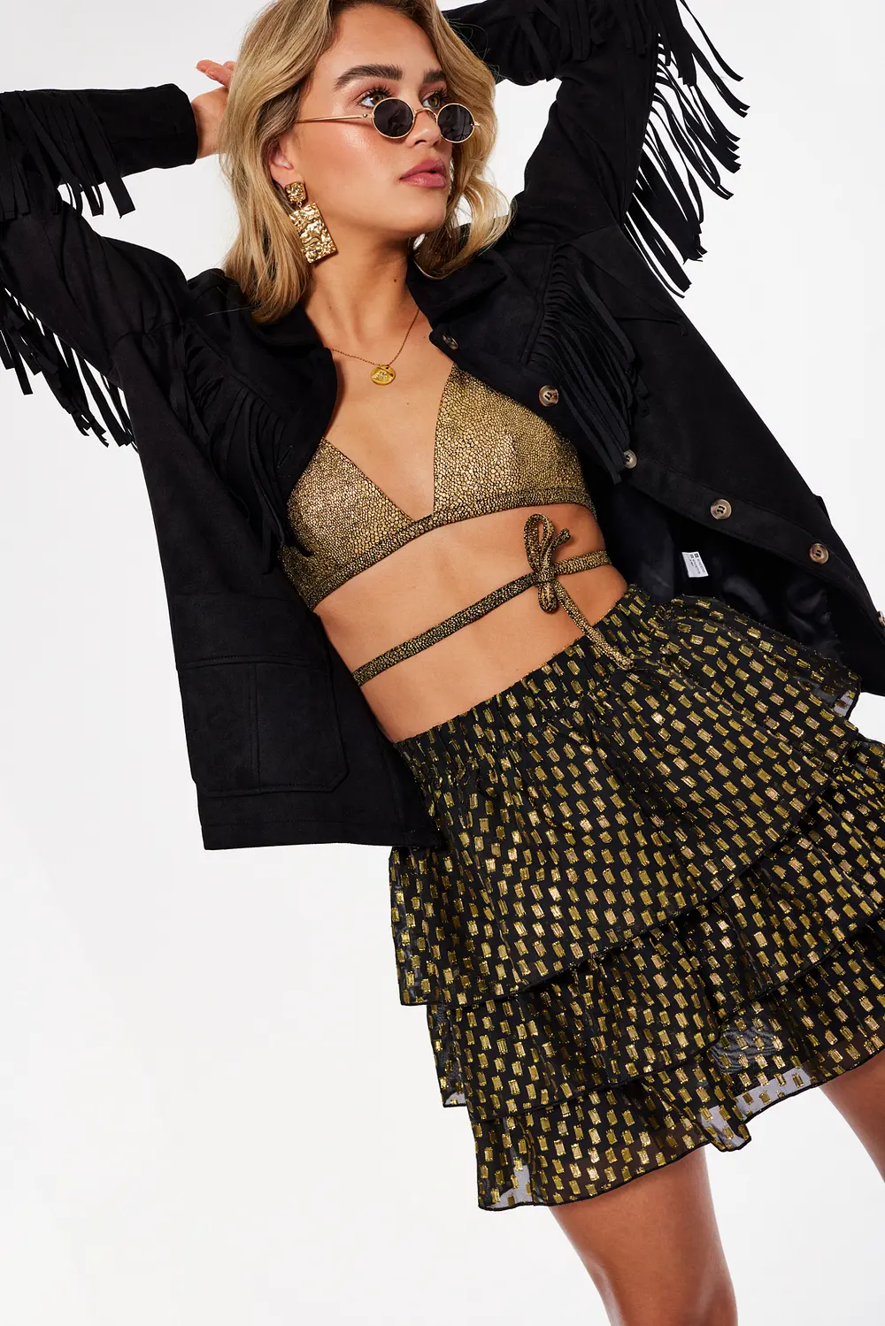 Ook fashion items met franjes zijn ontzettend leuk voor aankomend festivalseizoen. Dit té cute zwarte jasje met franjes van Loavies is mega fashionable en tegelijk handig voor als het wat frisser weer is op de dag van je festival.