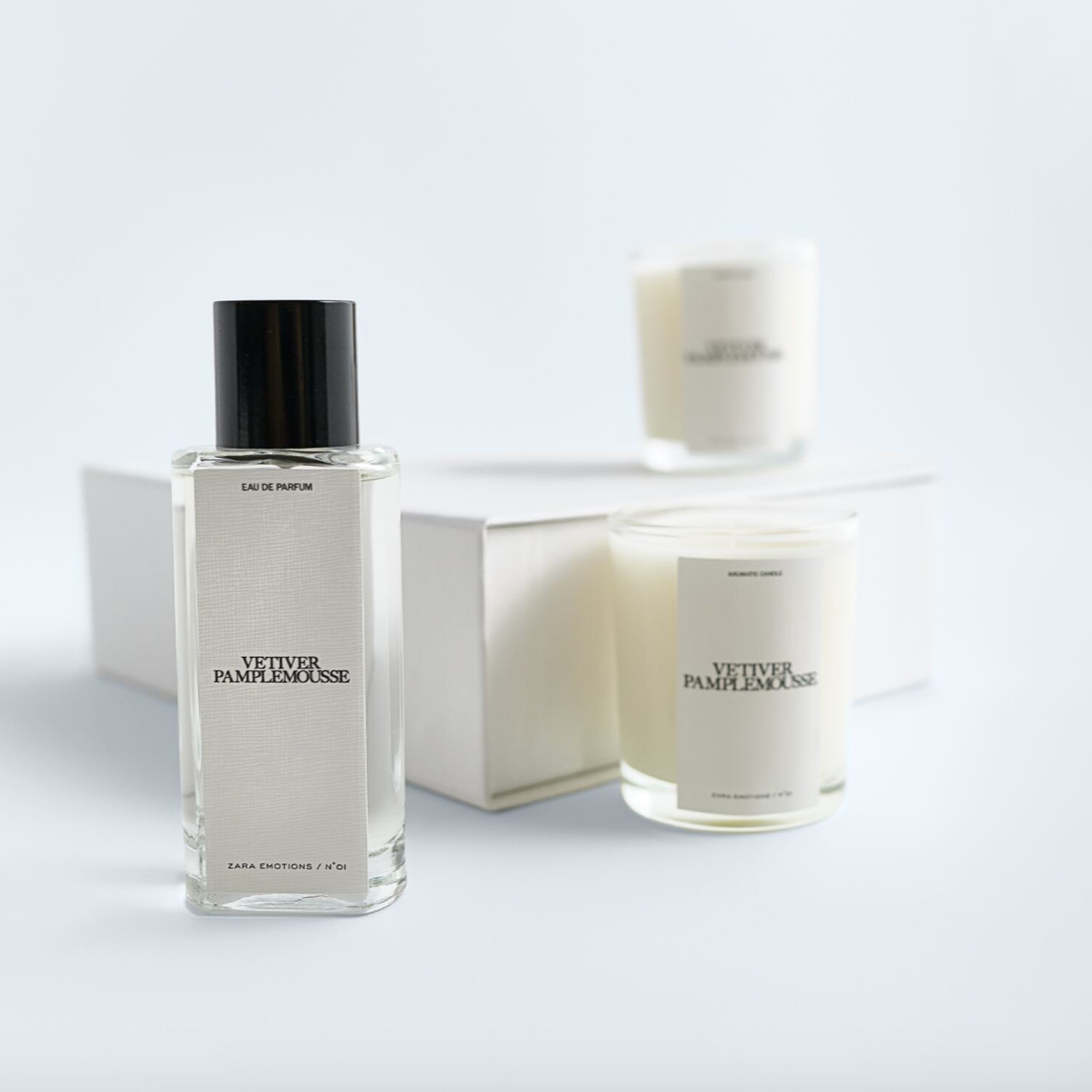 Het zou geen Jo Malone collectie zijn als er geen geurkaarsen waren, dus ontwikkelde ze deze ook voor Zara. De geur Vetiver Pamplemousse bevat noten van grapefruit, mandarijn en vetiver. Kom maar door.