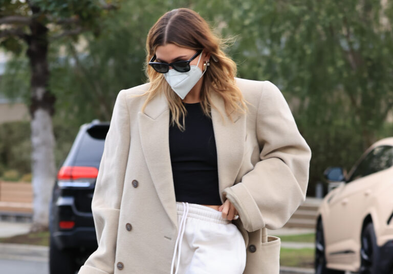Hailey Bieber bewijst met een oversized jas dat de perfecte quarantaine-outfit bestaat