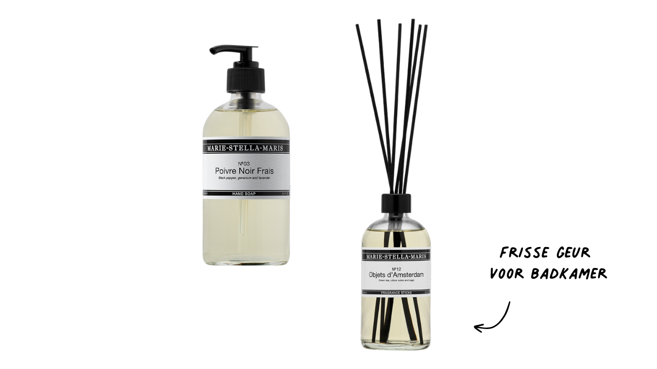 Dan tot slot: mijn favoriete geur voor in de keuken en badkamer. Want zeg je hotel, dan zeg je ook handen wassen met luxe zeep. De Poivre Noir Frais handzeep en diffuser geven dat frisse, maar verfijnde gevoel. En een kleine diffuser van Objets d’Amsterdam in de badkamer van Marie-Stella-Maris doet wonderen.