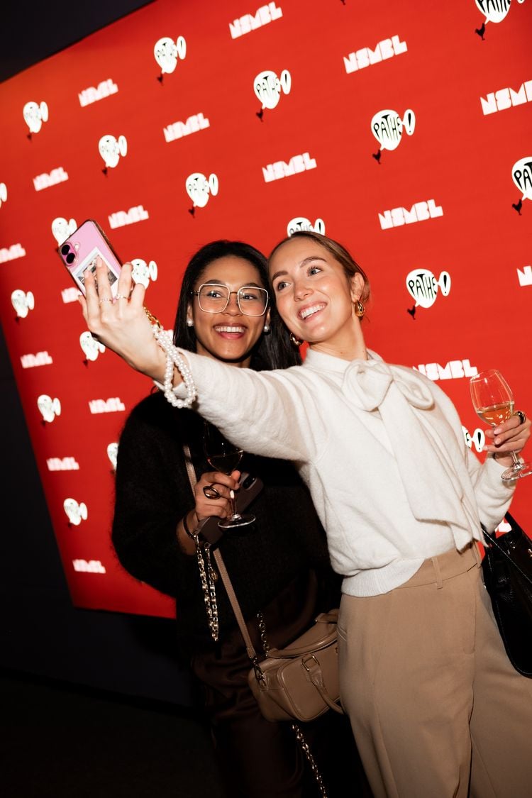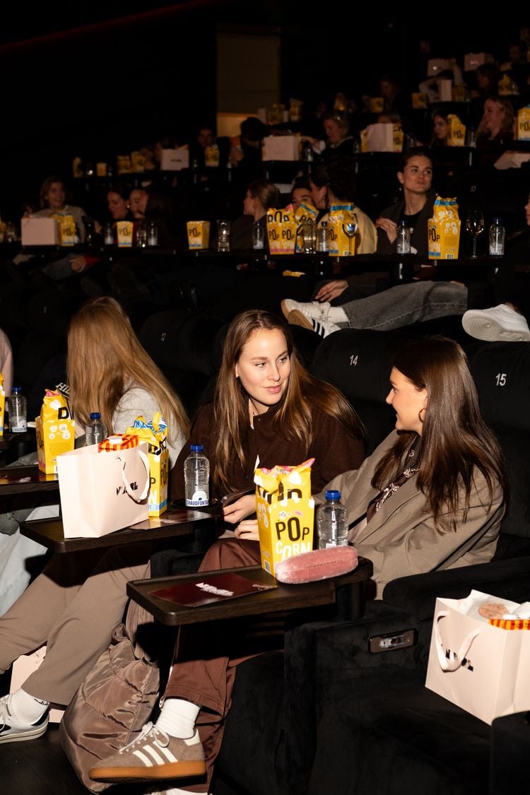 Op elke bioscoopstoel stond een goedgevulde goodiebag klaar met daarin onder andere een rode string van Hunkemöller, een glow serum spray van Authentic Beauty Concept, popcorn-melk van Oatly, een koekje van Het Koekemannetje én een NSMBL-koffiebeker.