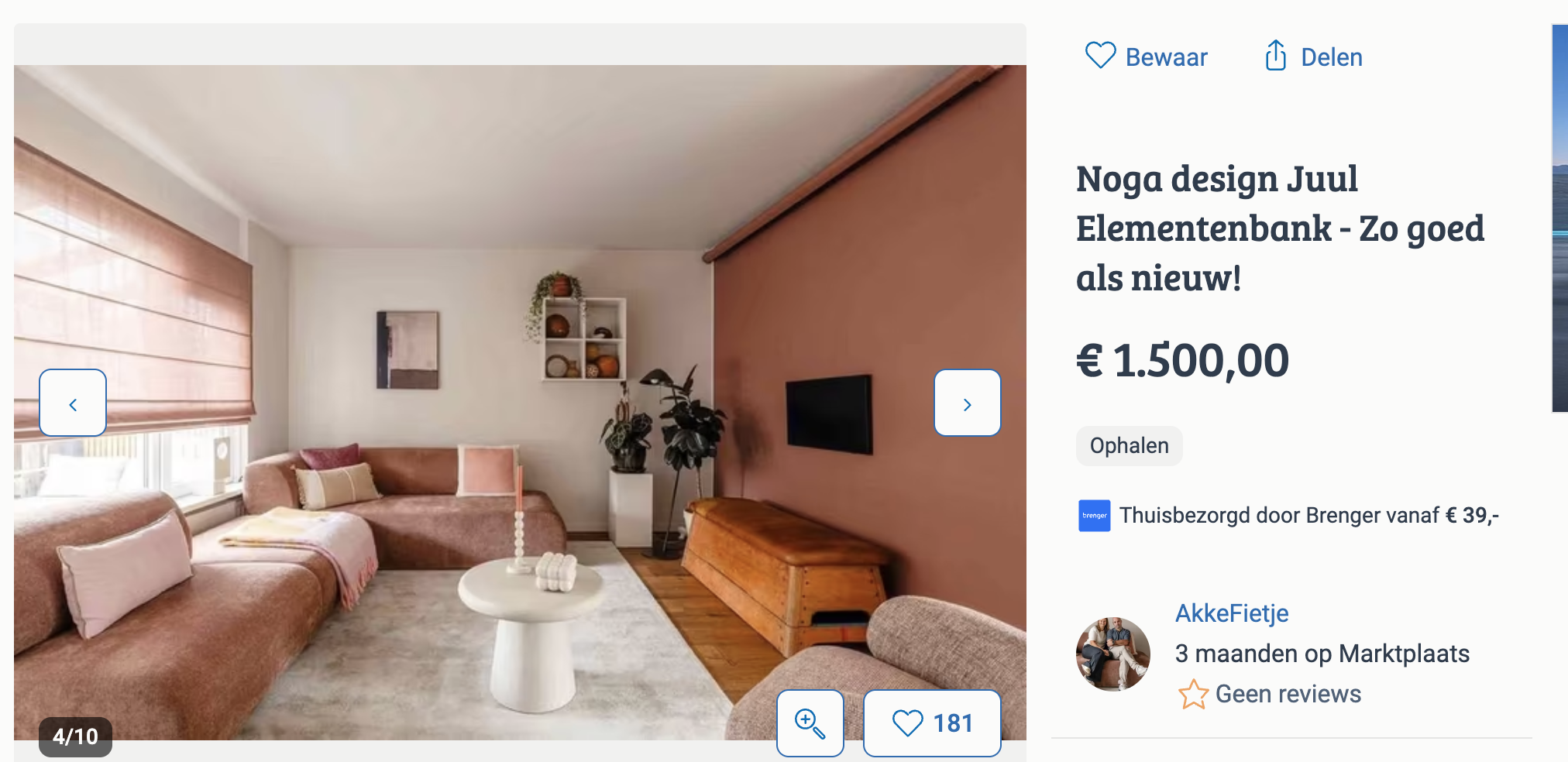 Vooral die roze bank is opvallend: die kostte in september nog 3695 euro en kun je nu ophalen voor ‘maar’ 1500 euro. Funny: het stel gebruikt op Marktplaats de naam ‘Akkefietje’. Is dat een kleine sneer naar de styliste?