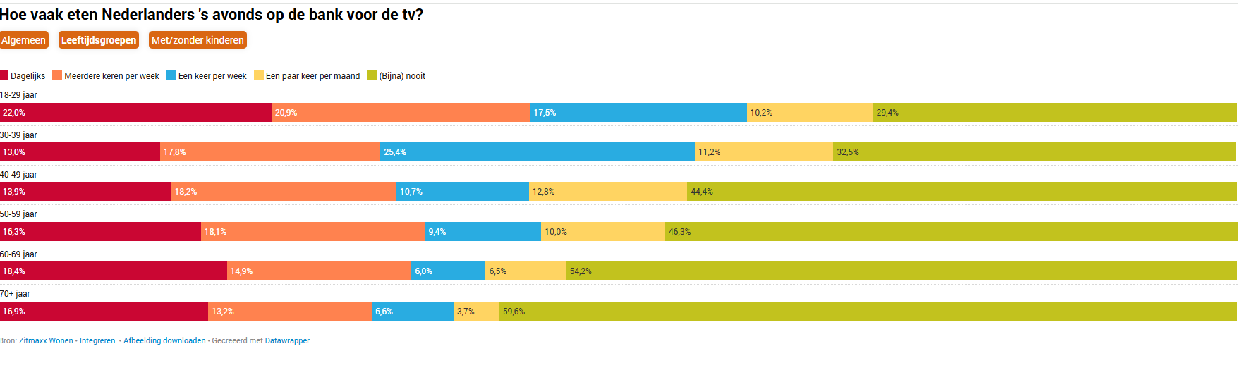 Soms knaagt de vraag: is het wel ‘normaal’ om elke dag op de bank te eten? Dit is hoe vaak je leeftijdsgenoten dat doen.