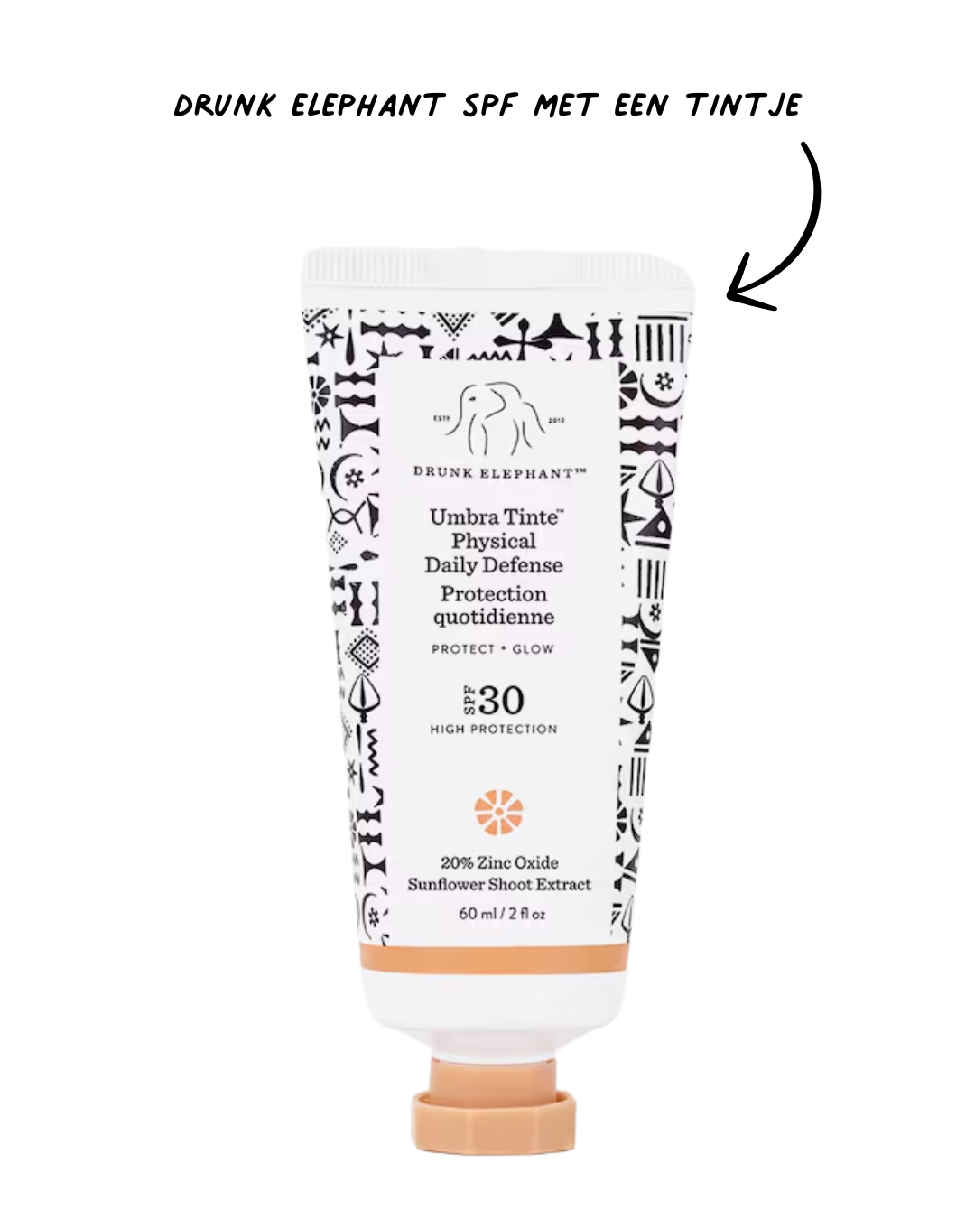 Draag je niet héél veel make-up, dan kan je er prima een SPF met een tint over aanbrengen. Dit zal namelijk veel beter blenden dan de welbekende witte variant. Deze getinte SPF van Drunk Elephant heeft een lichte dekking, waardoor je huid er ook gelijk glowy en egaler uitziet. Bevat SPF30 en maakt je huid niet vettig.